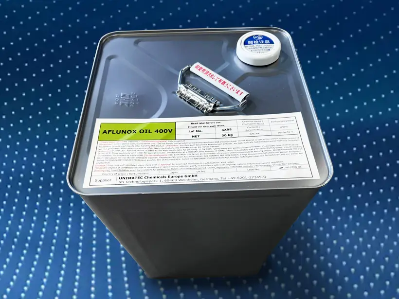 AFLUNOX® is a colorless, odorless perfluoropolyether (PFPE) oil produced by UNIMATEC. It has a unique branched-chain structure, with polymer chains that contain pendent trifluoromethyl groups (–CF₃) and is composed solely of carbon, fluorine, and oxygen. Due to the strength of the carbon-fluorine bond, the PFPE chain structure is highly protected, making it extremely inert. This imparts unique characteristics to the material.